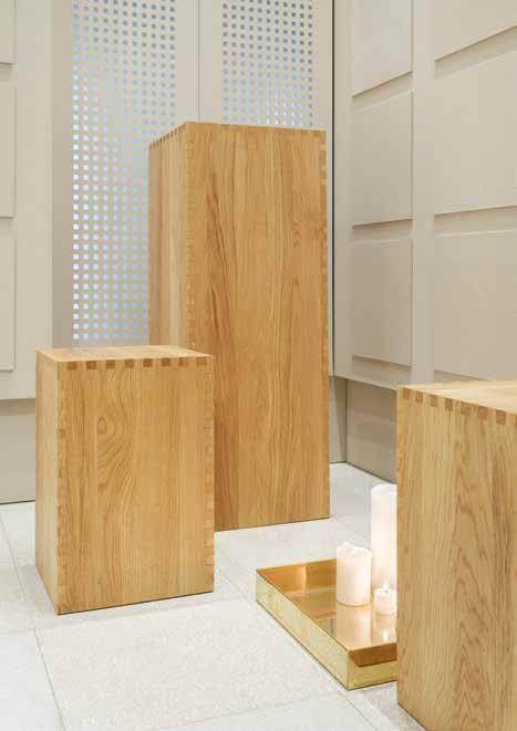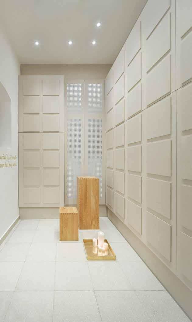 A templomhajó tágas térérzete a kolumbáriumba belépve egy magába fogadó, bensőséges kis helyiség habitusába vált át. Az enteriőr higgadt architektúráját fehérre festett falak és halvány homokszínű, szálcementből készült urnafalak látványa határozza meg. Az L-alakban a tér szélén húzódó, mennyezetig futó urnafalak felületét a kis fülkék szabályos rendje egyfajta racionális geometrikus mintázatként tagolja. A szálcement kőszerű felületi struktúrája a templomtér szabályosan faragott kő kváder keretezéseire, armírozásaira reflektál, amelyek a két világháború közötti (templom)építészet modern szerkezetekkel vegyesen használt, középkort idéző absztrakt utánérzései. A gyülekezet új kolumbáriuma a templom folyamatos építéstörténetének, fejlődésének szerves része. Építészeti megjelenésnek összhatásával és megjelenő finom utalásaival kapcsot képez múlt és jelen templomépítészeti hagyományai, valamint a hely korábbi és kortárs építészeti gesztusai között is.