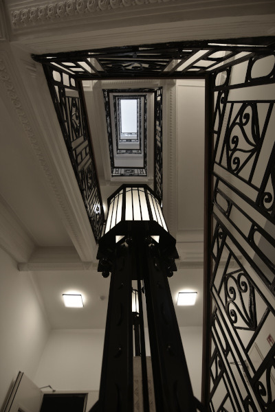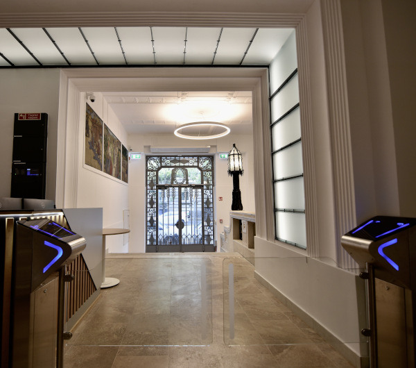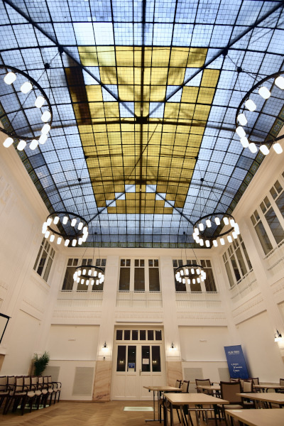 Launched in 2019, the Eötvös Loránd Research Network was tasked with maintaining, managing and operating research institutes and research sites separated from the Hungarian Academy of Sciences (MTA). From the summer of 2023 on, it will continue to operate under the name HUN-REN. Since March 2025, the network’s headquarters will be the building that was constructed between 1910 and 1912 according to the plans made by Alfréd Hajós and József Villányi for the Hungarian Farmers’ Cooperative. The former client, the Cooperative founded in 1891, was an organization representing the interests of aristocratic middle and large landowners, and the building thus reflected this level of demand and requirements. In the 1950s, it was used as the headquarters of the National Association of Cooperatives, and prior to its current renovation and modernization, it served as the office building of the Agricultural and Rural Development Agency. In 1911, Alfréd Hajós (architect and the first Hungarian Olympic champion, who won a gold medal in the 100-meter freestyle at the 1896 Athens Olympics and was dubbed as the “Hungarian dolphin” by the international press back in those days) and János Villányi designed the office building, which is still considered a modern one today, using new materials and modern technologies, with a five-story steel-framed glass wall on its street façade. The elaborate and sophisticated building was renovated to suit its new function and meet today’s requirements, whilst preserving its values. The original “curtain wall” façade overlooking the street has been completely preserved, and the design programme has retained the original layout of the building: a reception and exhibition space housed on the ground floor, a two-story ceremonial hall on the first floor, and offices above. The roof covering the representative two-story ceremonial hall on the first floor has been renovated, and the exterior covering converted into a thermally insulated glazed roof structure.