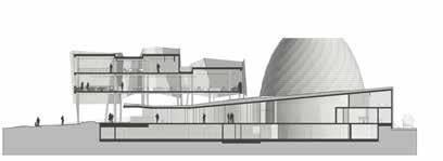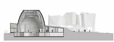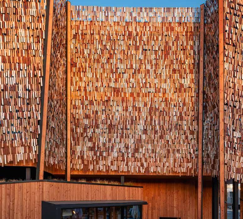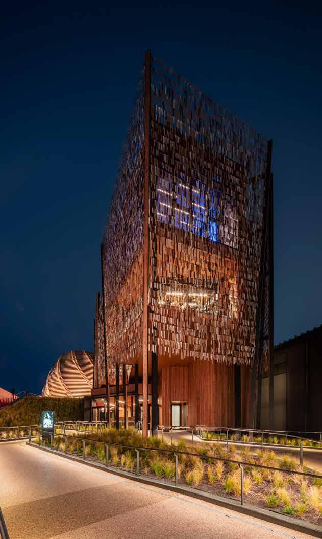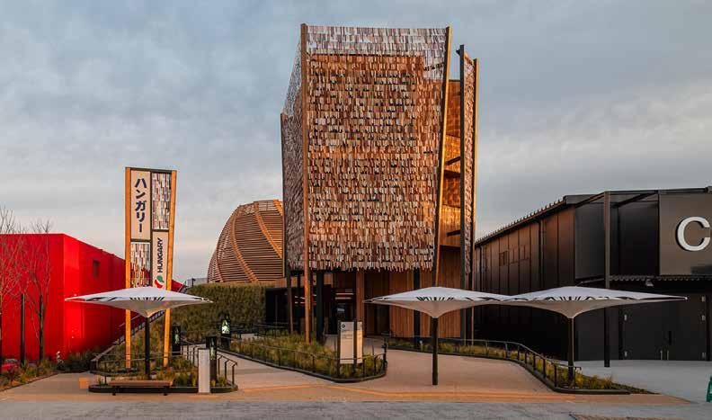 A world exhibition is always a significant opportunity and challenge for architecture, but at the same time, it also poses a huge architectural and aesthetic risk. With so many pavilions competing to outdo one another, it is not easy to find the appropriate style. In the predictable chaos ensuing here, it is not insignificant how a certain country interprets the purpose of its presence. The creators of the Hungarian pavilion have provided several fine answers to this challenge. The dominant material of the pavilion is glued wood, which ties in well with Fujimoto’s large wheel in terms of palette and materials, giving the pavilion some extra strength. It is also a valid decision to use other building materials, such as painted steel, glass, and a forest of mini flags that harmonize with the wooden expanses. The pavilion itself consists of several broken volumes, and the space left next to the asymmetrical cour d’honneur visitor paths has been used to create a hilly garden reminiscent of a flowery chamomile meadow. The interior of the dome remains completely neutral, in a „black box” style, with highlights reminiscent of a starry sky, whilst the exterior has a distinctive appearance with horizontally intertwined wooden beams in a twisted geometry reminiscent of basket weaving styles. The other chief element of the building is also distinctive: it is constructed from slightly irregular prismatic shapes, and its colors, volume and design successfully counterbalance that of the dome, creating a mysterious overall appearance with its small, ever-moving shading flags.