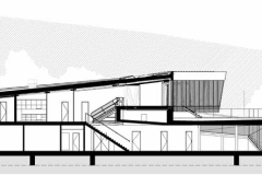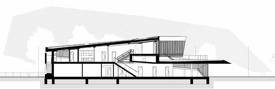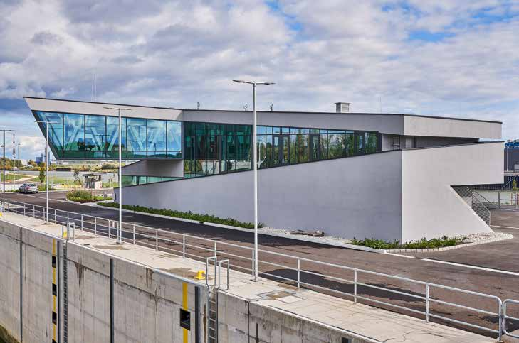 In June 2022, the Moson-Danube Estuary Artifact complex was inaugurated as a monument of great architectural qualities and outstanding significance. It is a good example of how a building can form a compositional unit with its natural surroundings whilst reaching beyond itself. This complex includes the dam, the navigation lock, the fish ladder, the operating building and the bridge, which provides access to the complex from Torda Island. The decision to involve a designer architect was exemplary. As a result, the engineering works, the newly created landscape elements of the facility and the operation building come to work together in visual harmony. The landscape as a medium embraces the structure, and the finely designed environment of the building catalyses the process, providing a transition to nature. A sculptural wall of stones leads to the entrance of the building. The raw, textured surface of reinforced concrete and the rising line of the wall express the building’s connection to nature. The spaces, the cladding and the use of materials reflect the industrial world with a sophisticated appearance. The cantilevered part of the building is dominated by the lattice structure, which lends the space a futuristic effect with its slightly shimmering greyish colour.