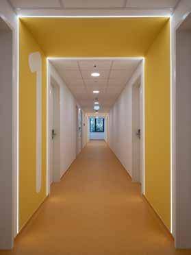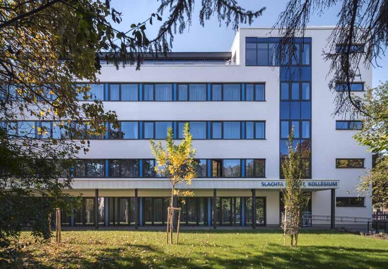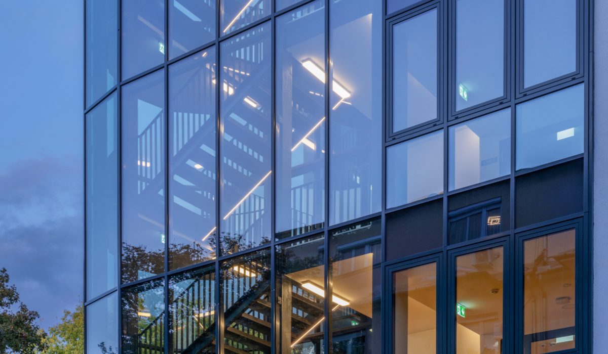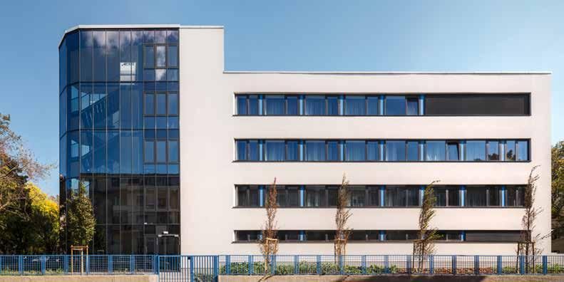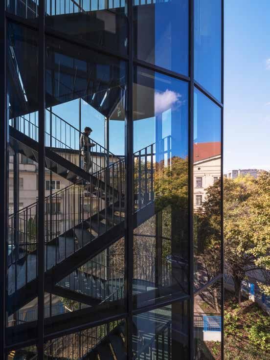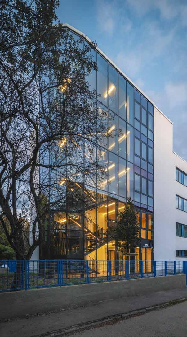 To the west of the capital city, Budapest, along the road leading to the motorway, a blue-framed industrial building had stood vacant for more than a decade. The area itself, squeezed between the main roads and the nearby railway line, was a crowded mixed industrial and residential zone, which in recent decades has increasingly turned into a residential neighborhood. The nearby industrial buildings were gradually converted into office or residential buildings, but the abandoned former laboratory center remained on this corner lot as if an enclave. Recognizing the building’s potentials, architects from Közti, Alfréd Peschka and Gabriella Öcsi, together with their colleagues, proposed a conversion to the new owner instead of a planned demolition. The new function involved students’ rooms and multifunctional and communal spaces suited for a variety of training activities. The existing structure and the strict layout of the floor plan proved to be almost perfectly suited to accommodate all of these functions, so the conversion required only some minimal expansion after the demolition of the damaged or unnecessary structures.