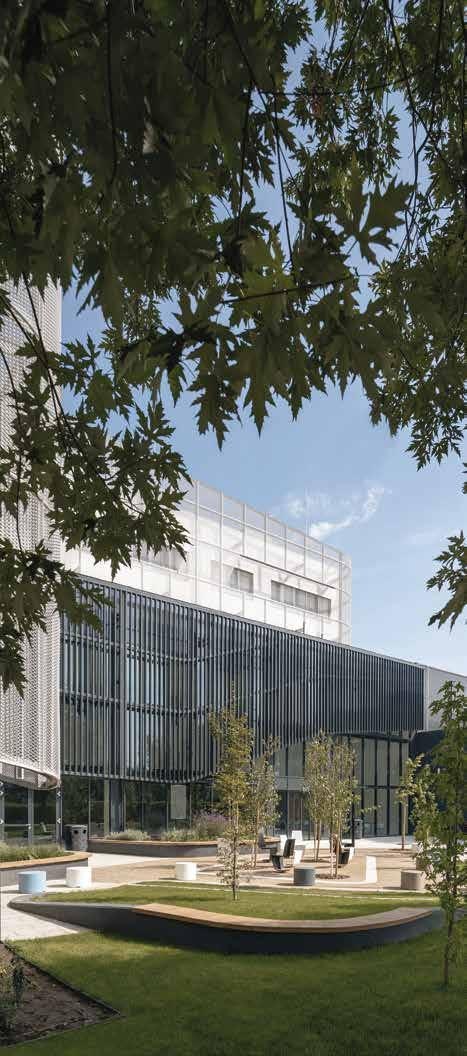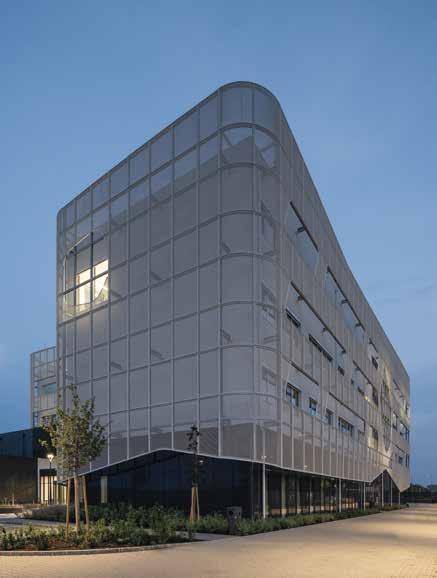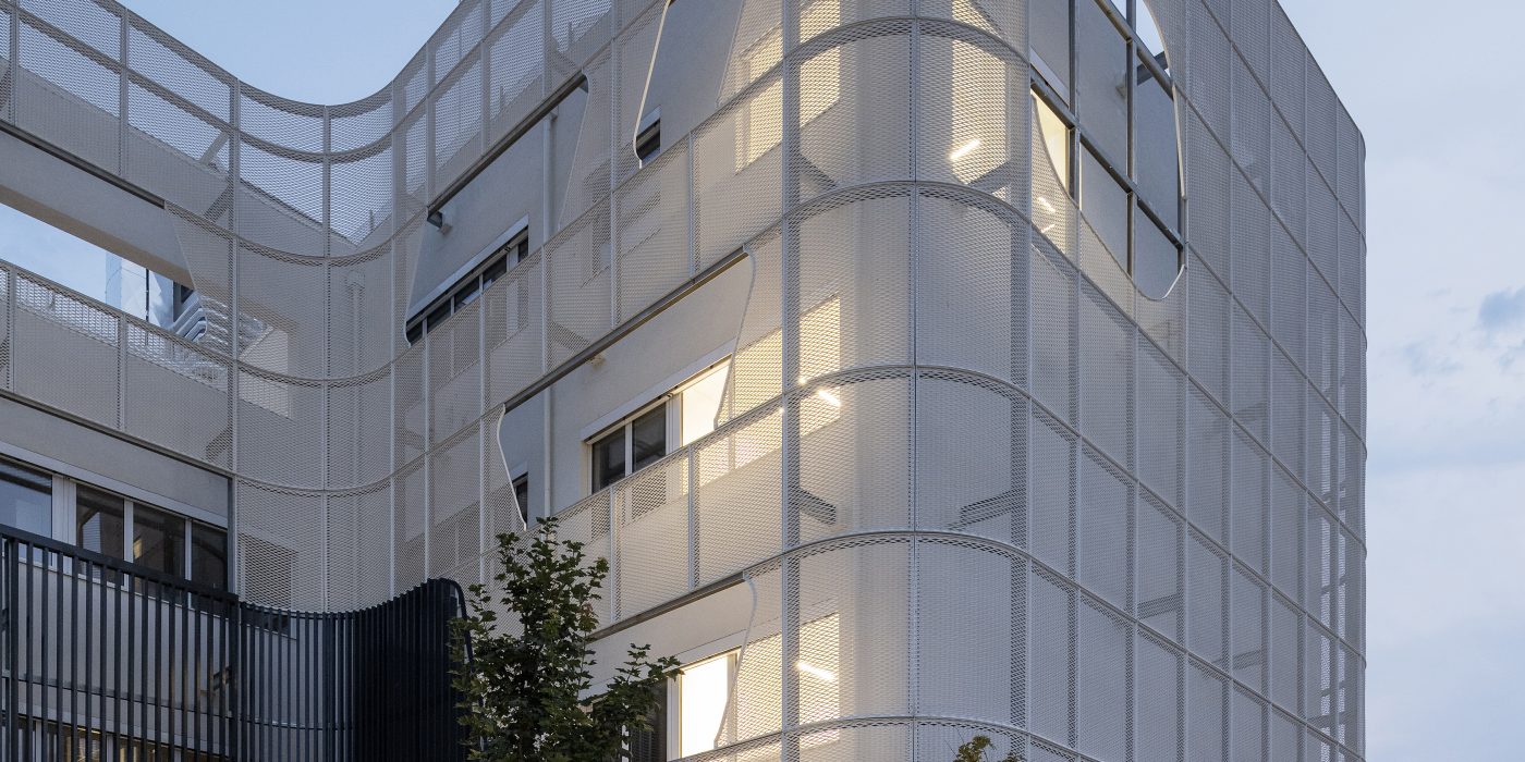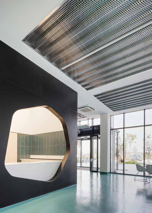A few years ago, the University of Debrecen embarked on a new development: it wanted to implement and launch a new type of pharmaceutical education, unique in Hungary, by combining industry, manufacturing, and theoretical education, with all these functions being melted into one single building. Here students can observe the entire process of pharmaceutical manufacturing, starting from research to product production. This challenge is also significant from an architectural point of view: how can so many different functions be merged within a single building? Instead of the usual industrial layout, which is the hall + neck + main building, a different configuration was devised here. The goal was to merge the two volumes and two functions, and what’s more, they wanted also to visually connect the auditorium space with the factory unit. The architects drew on one of the chemical processes for this project: melting, which in this case also means merging and blending. The mass of the building on the entrance side already conveys the duality resulting from the combination of functions upon our arrival: the four-story university office building-style educational wing and the single-story production plant form the forecourt. The difference in facade height is bridged over by the two-storey volume of the auditorium, which partially extends over the industrial hall, thus creating a balance between the two heights. The architectural concept is also based on the relationship between these two significantly different functions and mass ratios. According to the creator’ intention, the two functions are connected not only by the auditorium itself, but also by a mesh sunshade that symbolizes their fusion.